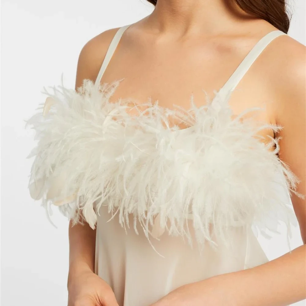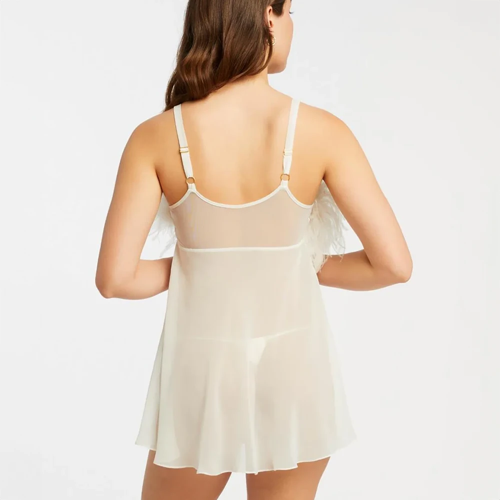 The Amalfi Babydoll is a playful must-have. This set includes a sheer chiffon skirt, and stretch netting back for ease. It also features a whimsical, detachable feathered neckline. Not to mention, a charmeuse g-string is included. The Amalfi Babydoll is not just a flirty invitation, but also a fantasy come true in the bedroom.