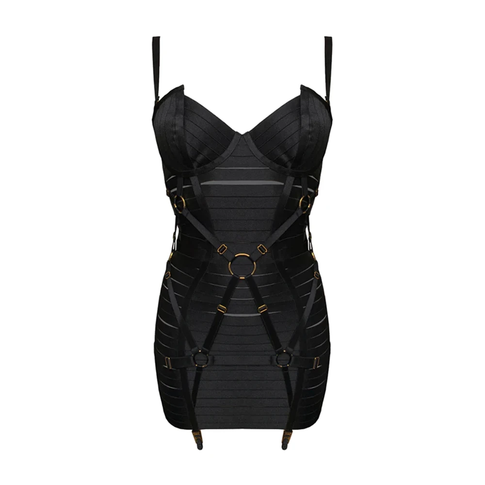 The Adjustable Bondage Angela is the ultimate in Bordelle bondage luxe, with total adjustability to flatter every curve. This piece is made up of over 150 24k gold plated components. Each dress takes a whole day to make!