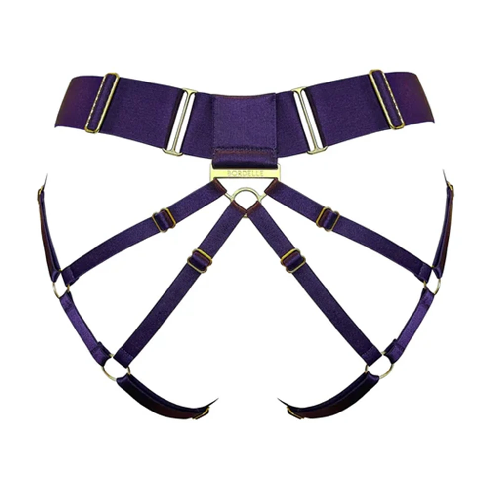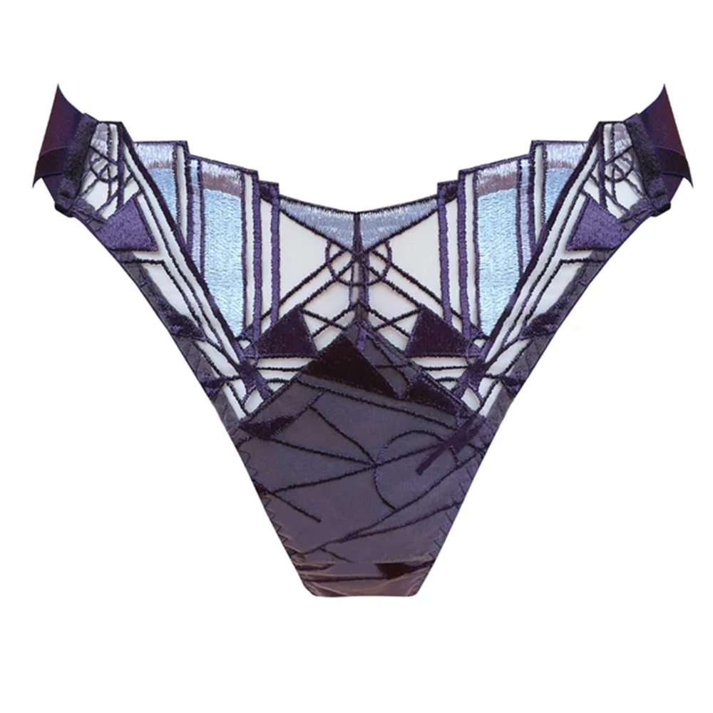 A wrap over, fully ouvert, high waisted embroidered voile brief. Soft wide band elastic is wrapped around the body and secured with oversized swan hooks, creating an eye-catching style that showcases the geometric embroidery. Style with or without the detachable suspender straps.