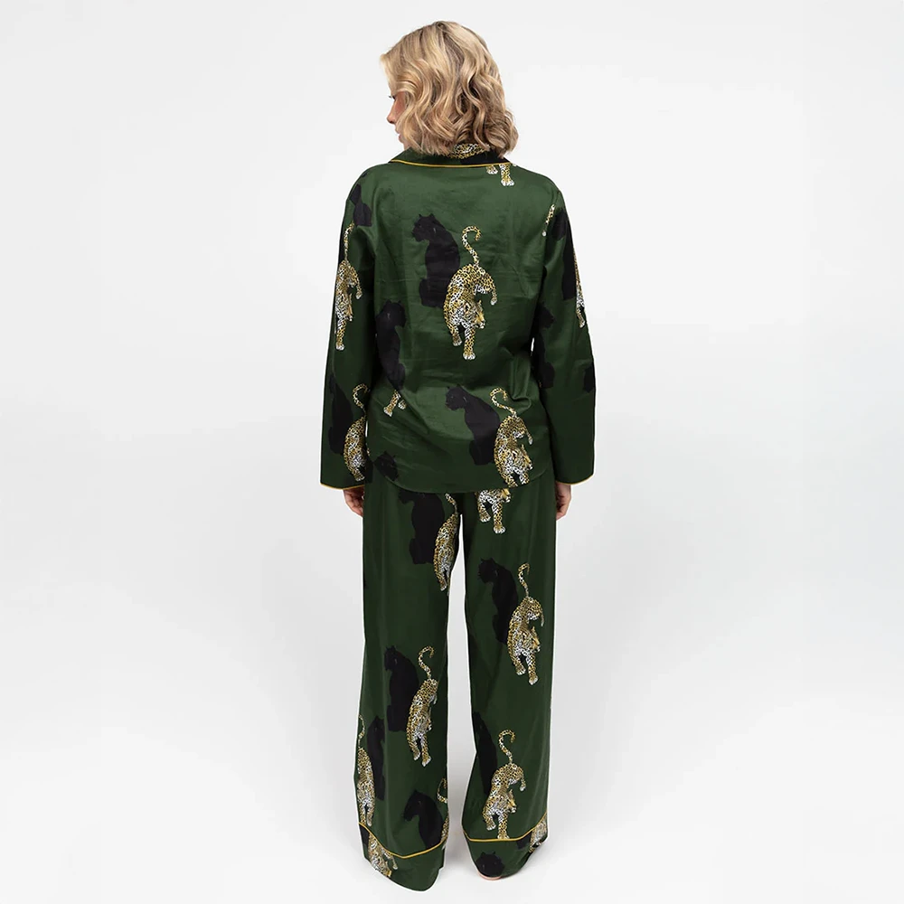 When your pyjamas look this good there’s no real need to get changed. Let your pyjamas bring a bite to your calm evenings with our Olive Womens Olive Green Mix Leopard Print Long Sleeve Wide Leg Pyjama Set. 60% cotton and 40% modal, this pyjama set is sure to have you feeling comfy from putting it on in the evening to finding excuses to keep it on in the morning. Wild nights or lazy mornings, these pyjama bottoms work for both. With the playful silhouette of a long sleeved pyjama top, rocking a revere collar and shaped bottom hem paired with the wide leg bottoms, which have an elasticated back waist keeps things easy you can be sure you look relaxation ready in style. With detailing of a lime green trim, black covered modal functional buttons and a matching drawstring, your most stylish look of the day may be the one you end up wearing to sleep in. Both pieces are available individually, letting you mix and match sizes and styles to your liking.