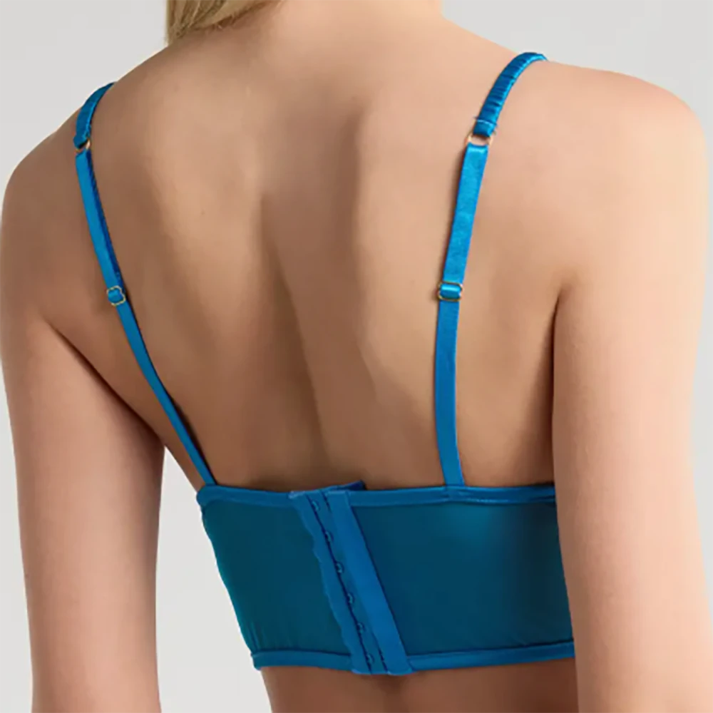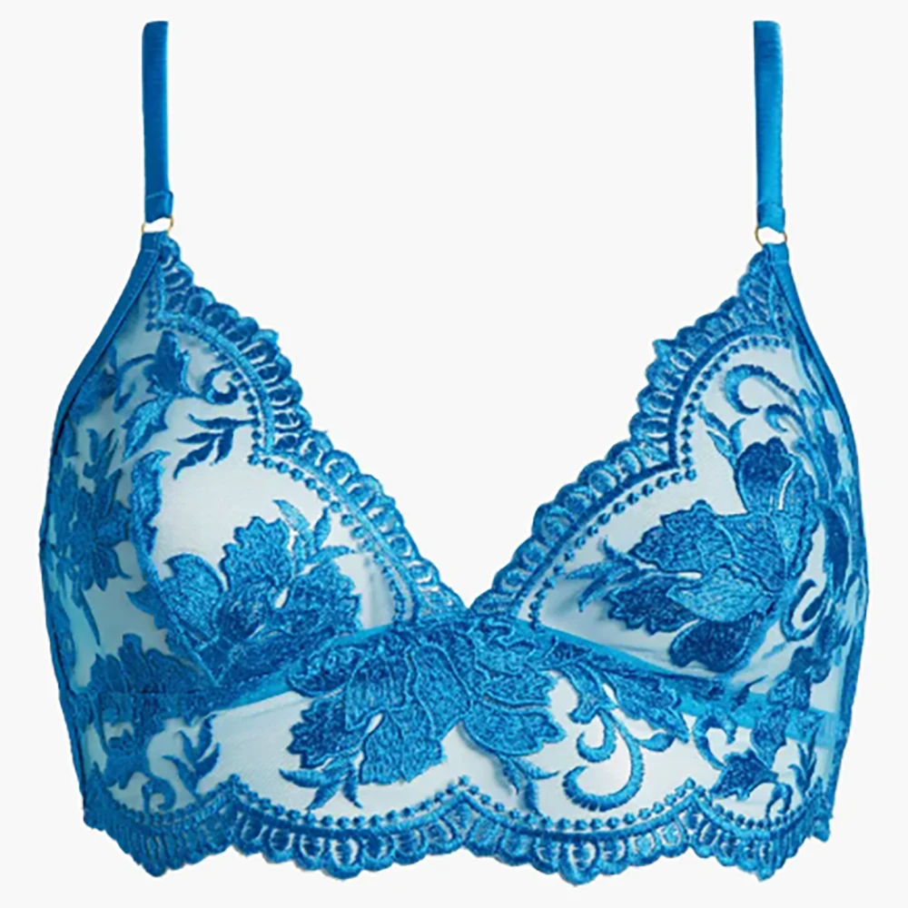 Scalloped edges and tonal embroidery define this longline bralette, featuring vertical seams that provide a subtle lift.