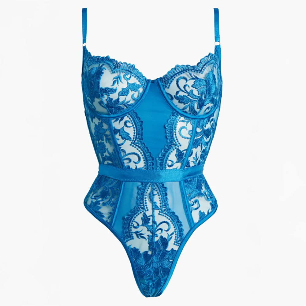 Feel your most exquisite in this underwire bodysuit patterned in tonal embroidery and designed with shiny satin trim.