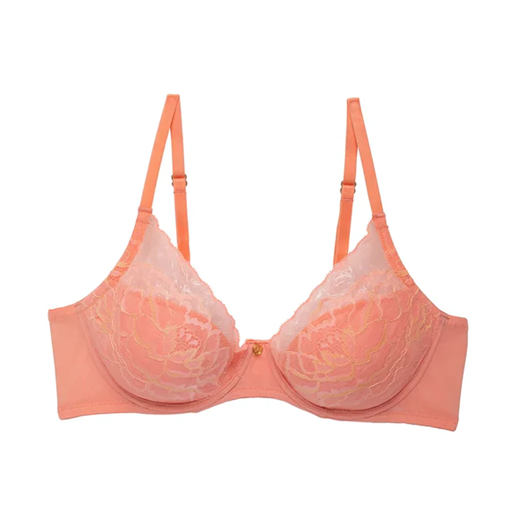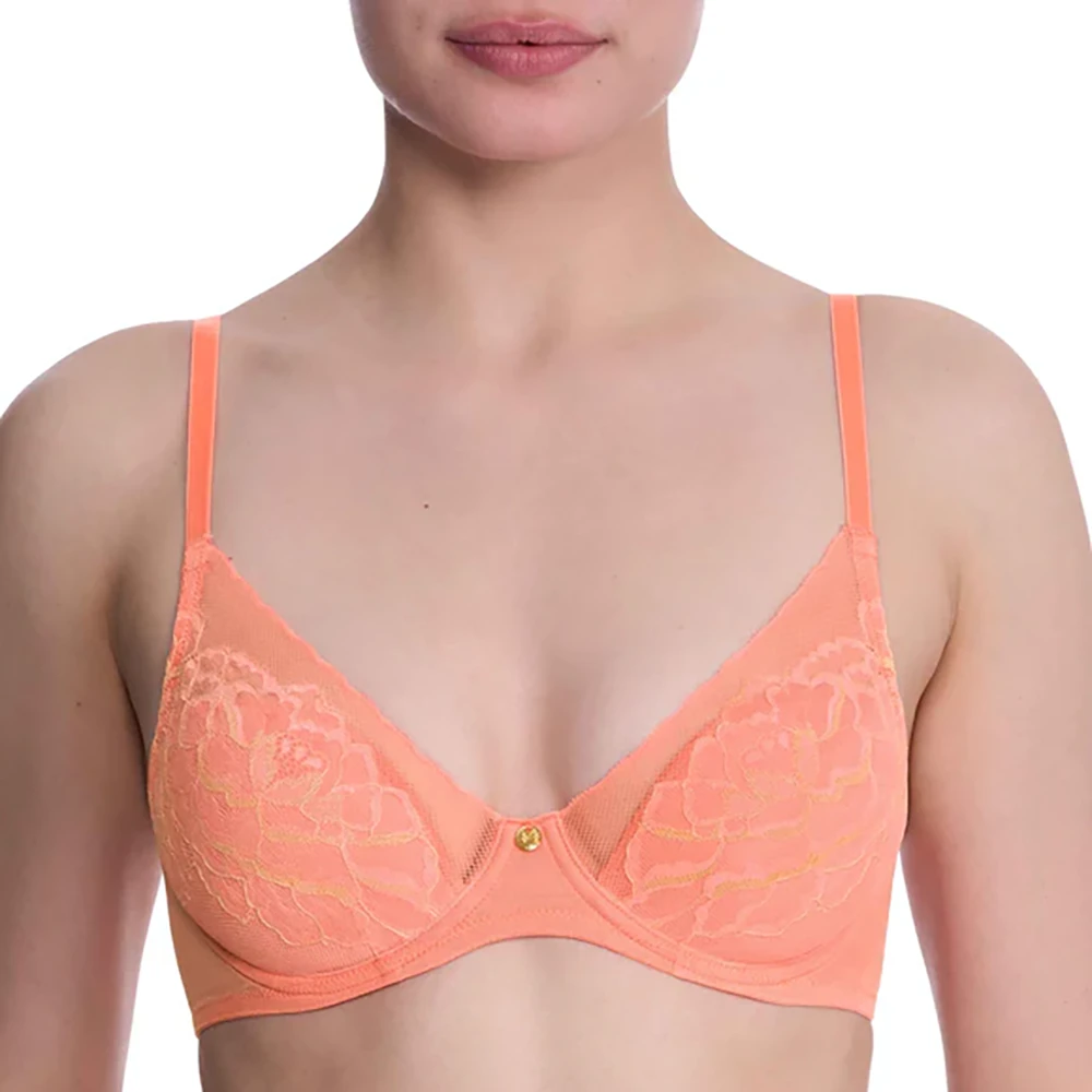 Innovative molded, floral lace overlays smooth cups for a seamless edge that disappears completely under clothes.
