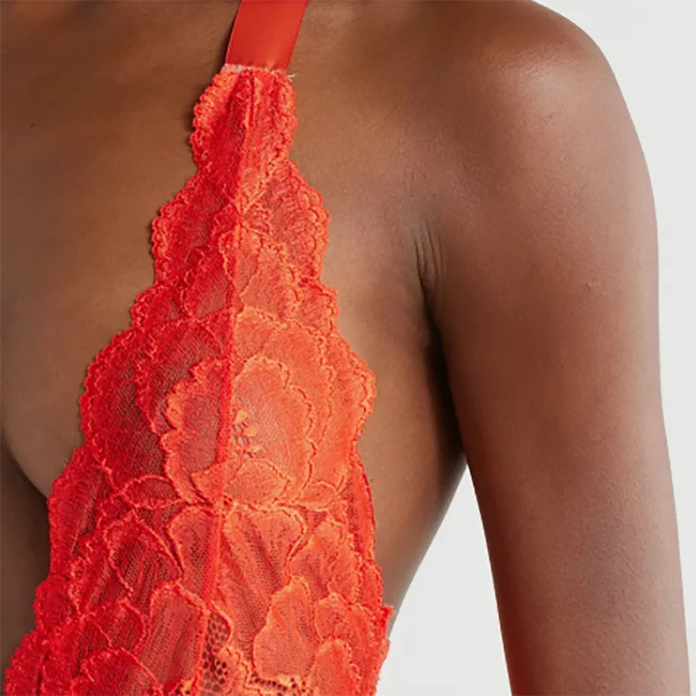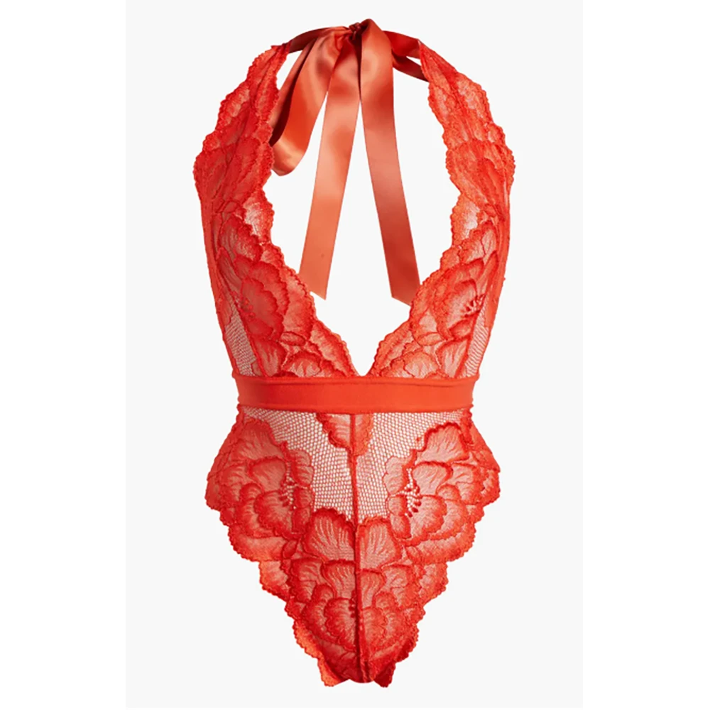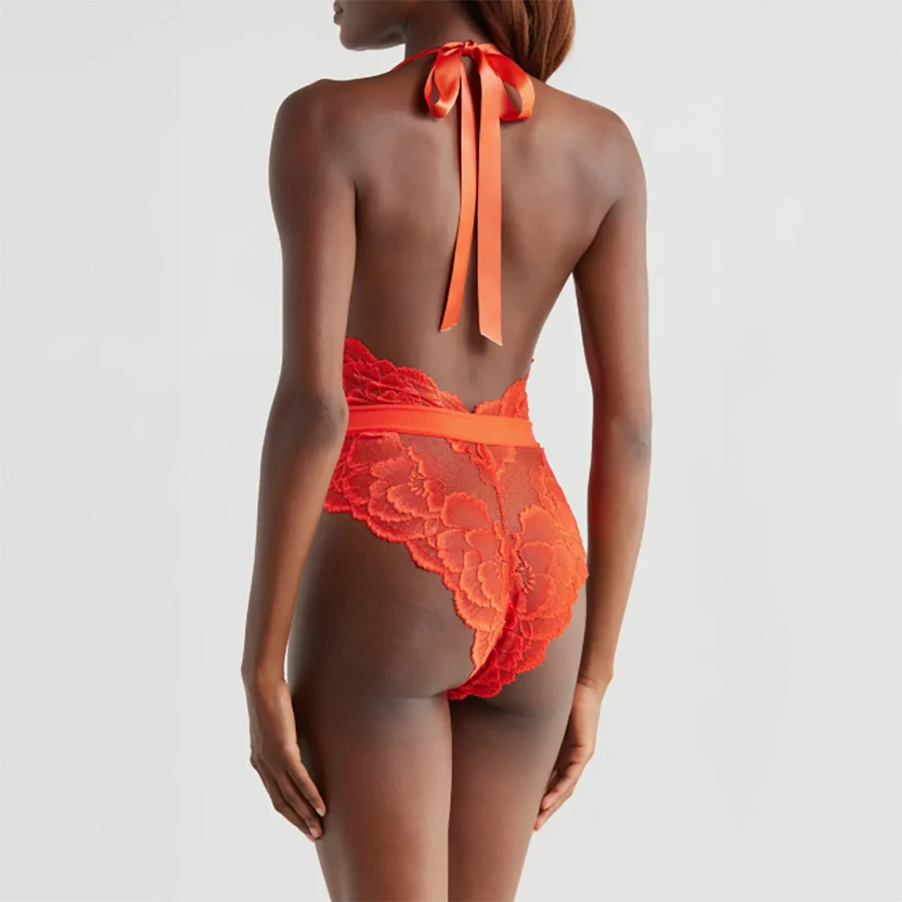 Sweet floral lace lends enchanting romance to this sheer teddy fashioned with scalloped edges and a halter neck.