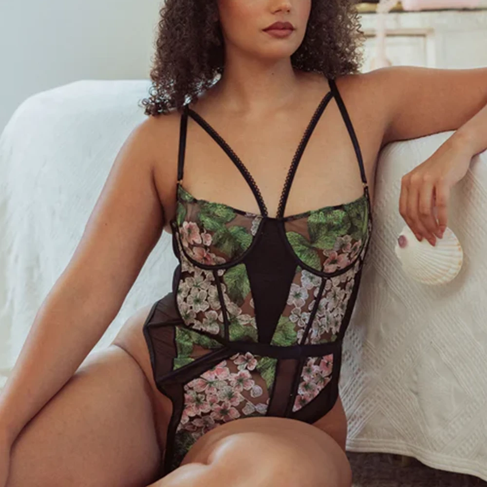 Our most loved bodysuit style re-imagined in a Hydrangea embroidery made with a black sheer mesh base. Trimmed with satin. Thong at back. Snaps at gusset. Underwire cups, adjustable straps, hook and eye at back closure.