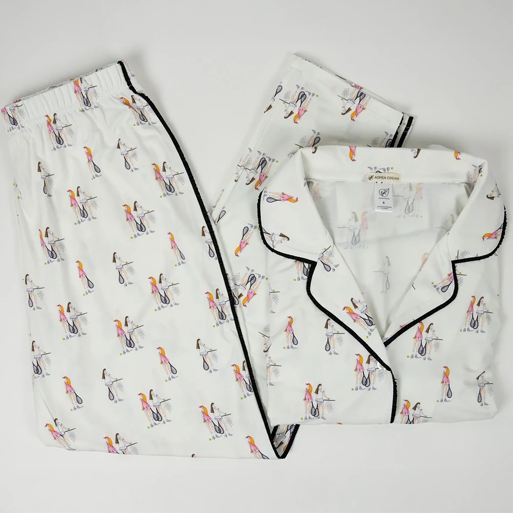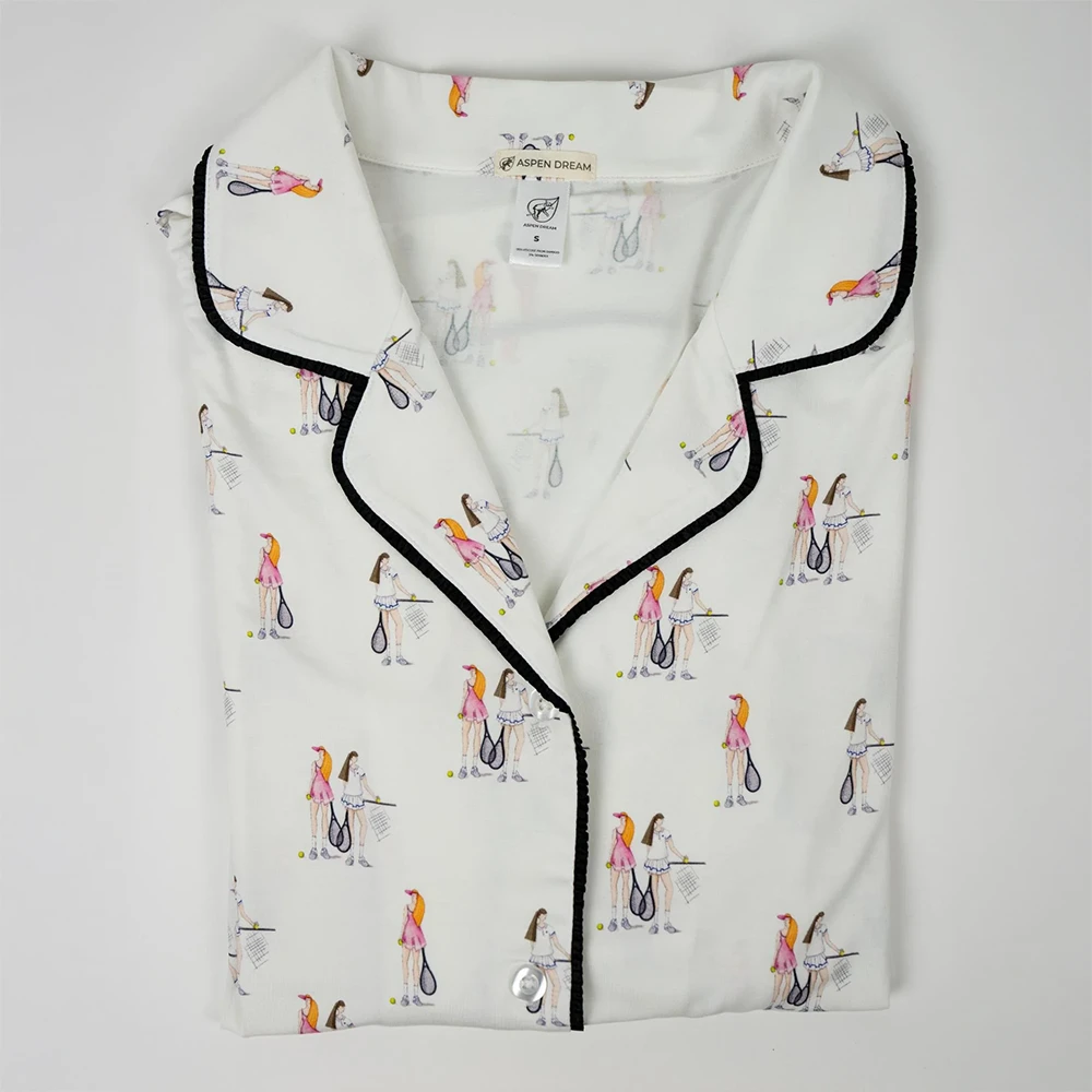 The Jolene Pajama Set features an elegant hand-drawn tennis print inspired by the refined spirit and graceful movements of the sport. The crisp ivory background is adorned with delicate illustrations in soft pink and navy, capturing moments of poised action and leisurely sophistication. Accented with refined black ruffled piping, this set brings a fresh, contemporary edge to classic loungewear.