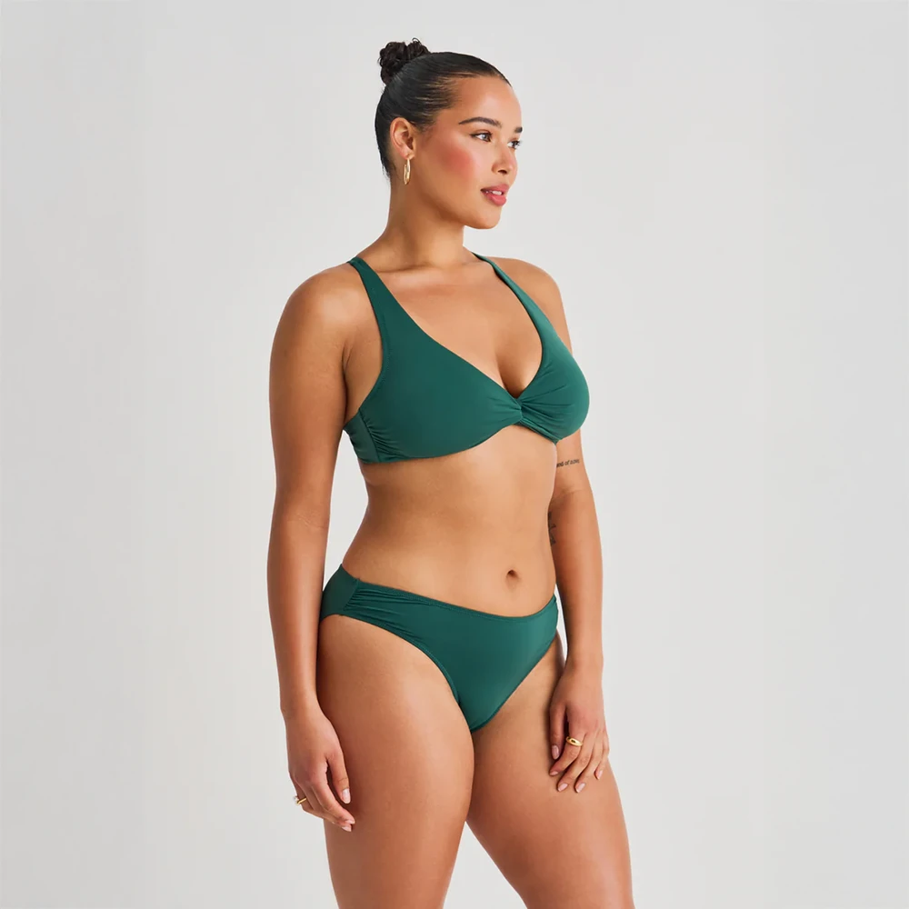 A classic silhouette featuring a deep jewel tone to complement sunkissed skins lounging in the golden sand.