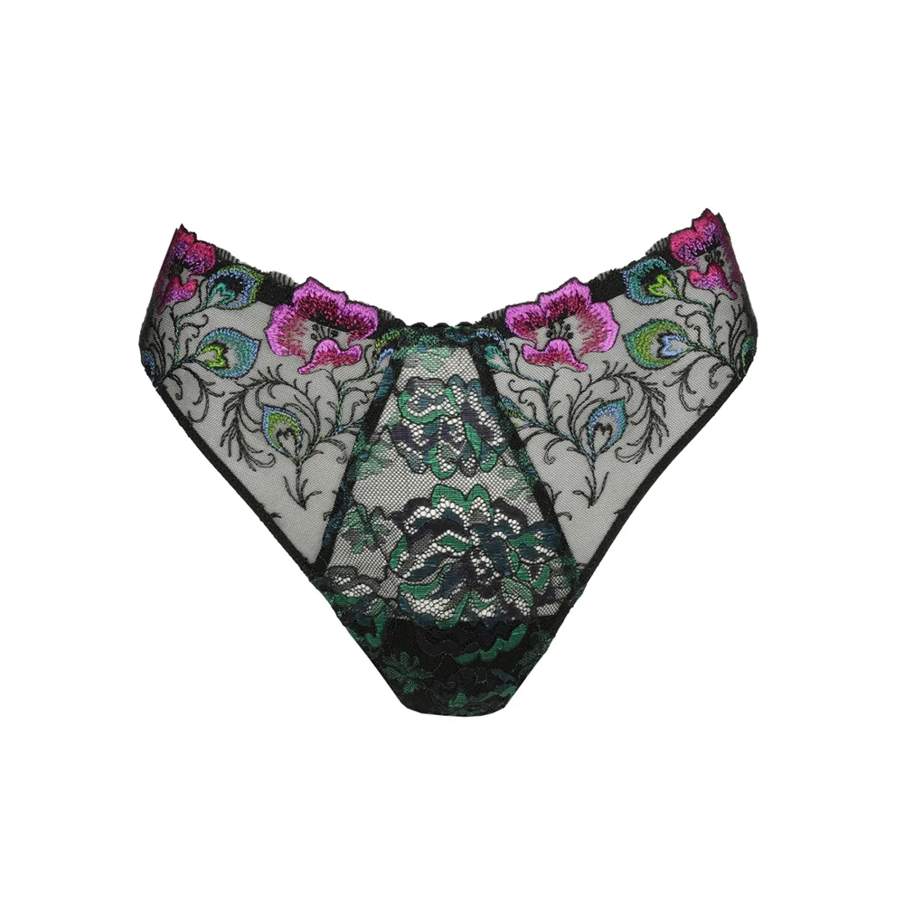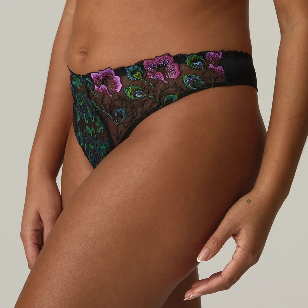 This thong is cut exceptionally high at the legs, leaving your bottom fully uncovered. Peacock Feather is a blend of vivid colors. Warm fuchsia and intense shades of blue and green create a stunning contrast against a black background.