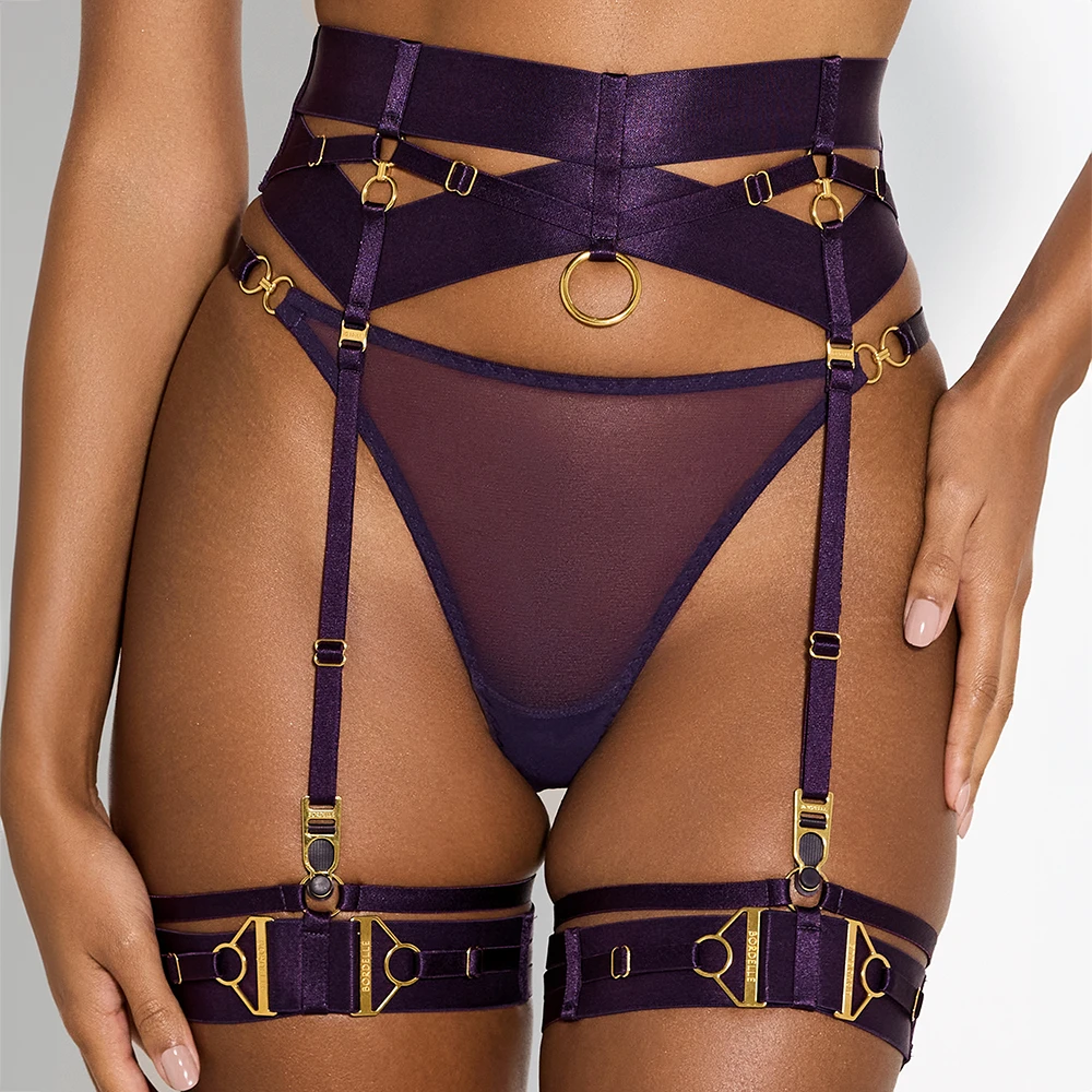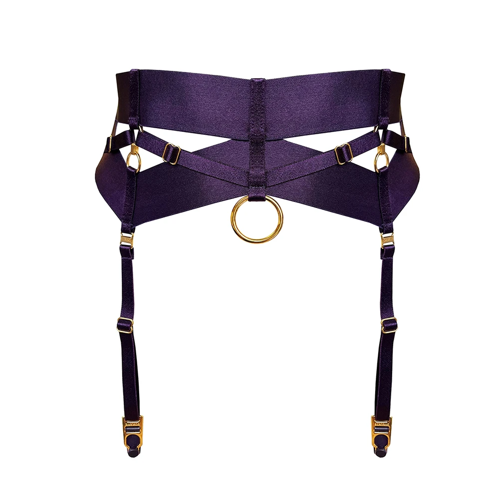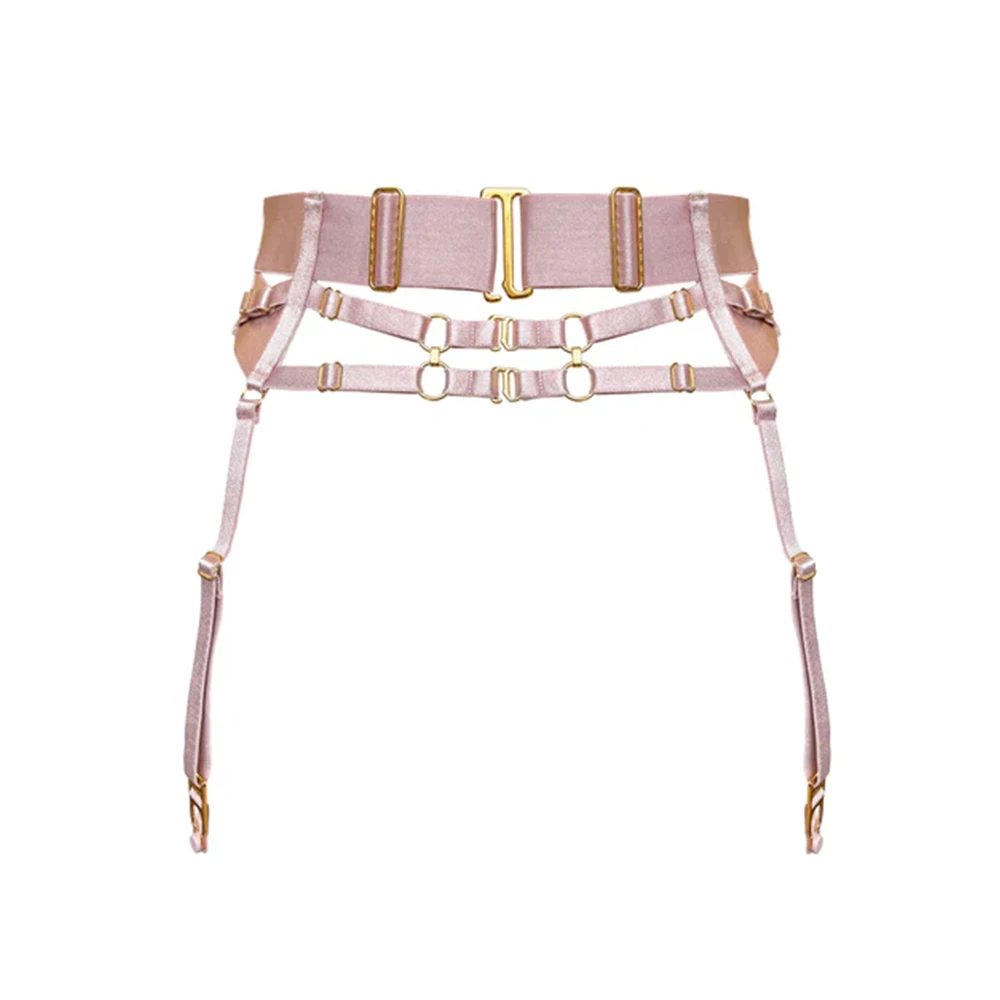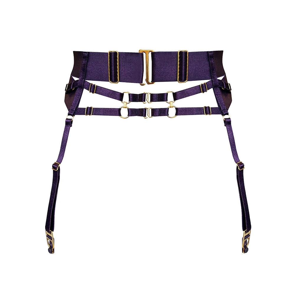 An all-elastic suspender adorned with 24k gold plated components. Soft wide band elastic strapping contours the waist, featuring adjustable harness and peep details, finished with 4 suspender clips for wear with garters or stockings.
