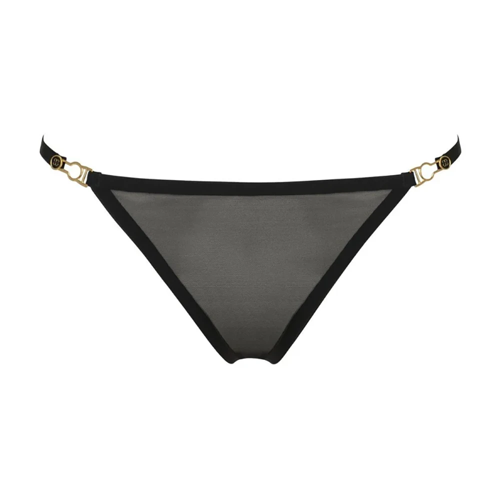 Tanga in transparent and soft tulle, opening on the sides with buttons and golden jewels.
