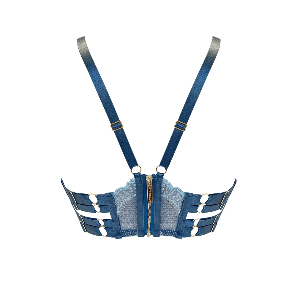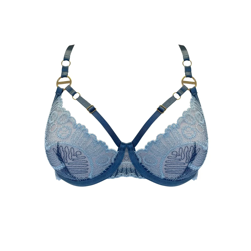 Glow-in-the-dark embroidered tulle bra. An underwired lace balconette bra in delicate embroidered tulle, featuring a new 24k gold plated branded component representative of elemental symbols. Satin elastic strapping adjusts at the sides, into a decorative lace panel at the back, complete with 24k gold plated zip fastening.