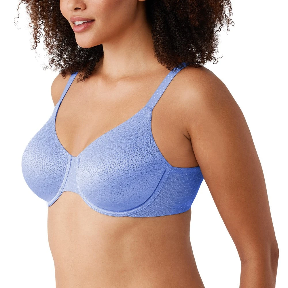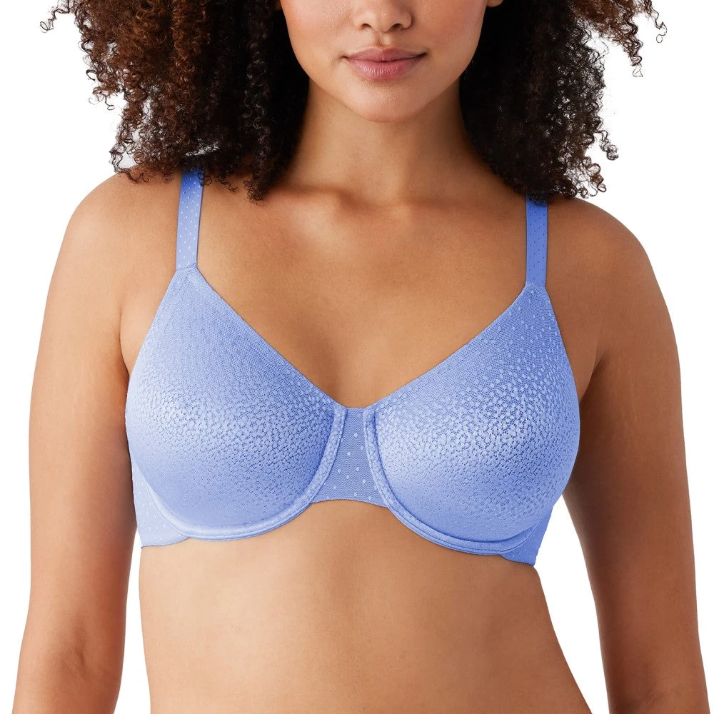 - Full coverage two-ply cups of soft inner fabric covered with pretty dot jacquard fabric with accent sheen